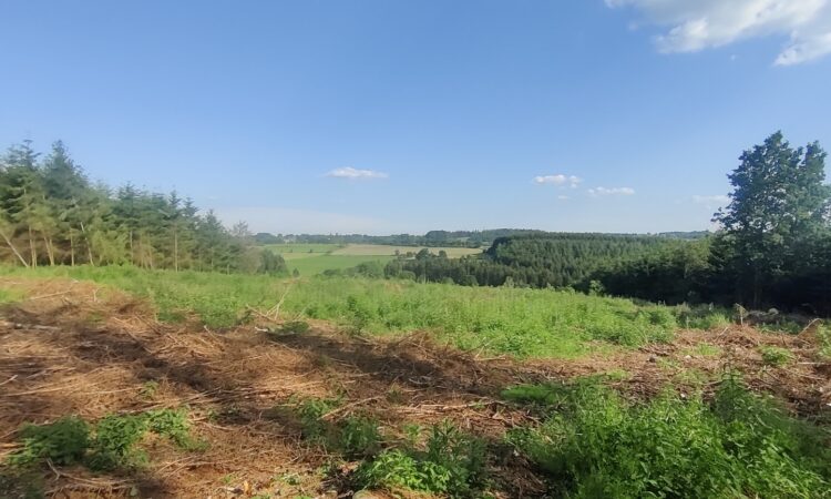 Essences:Feuillus, douglas d'aspect 20 ans, et fond de bois (terrain nu, déboisé)