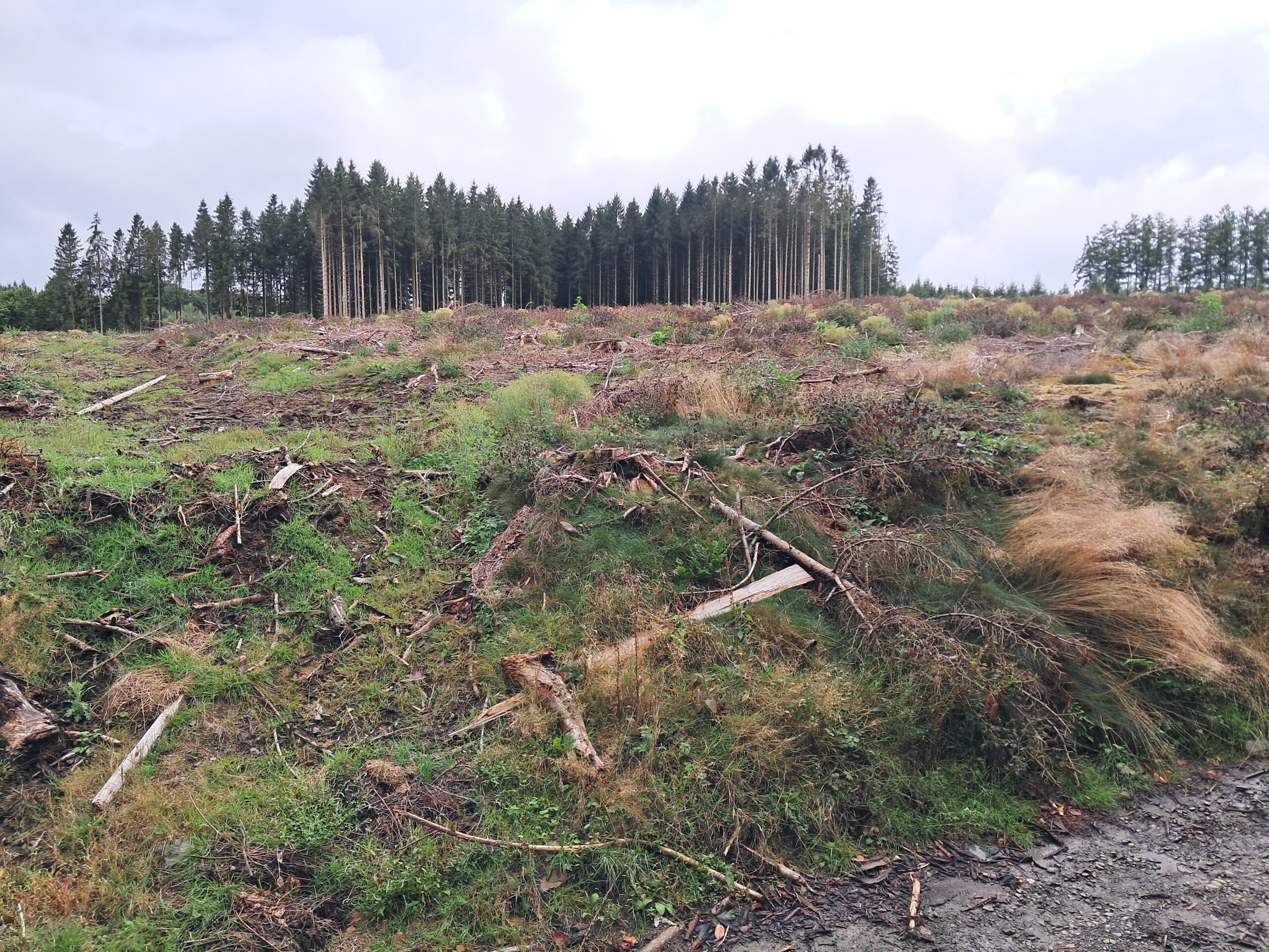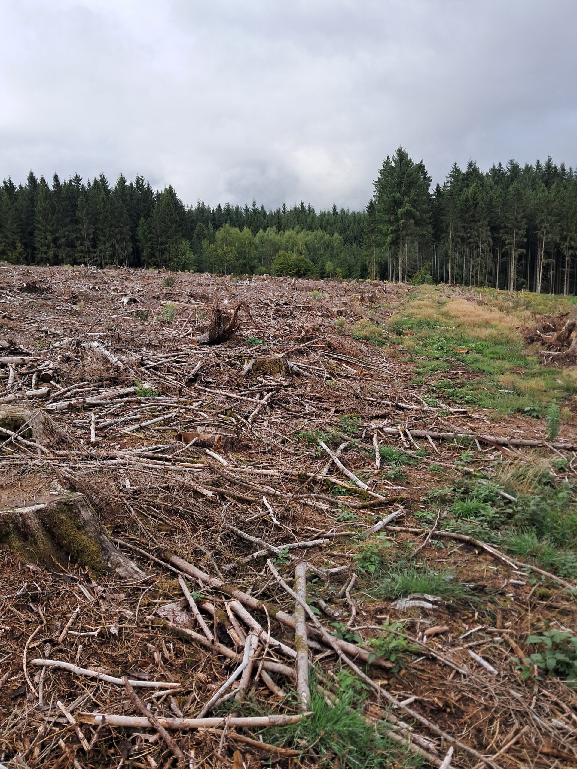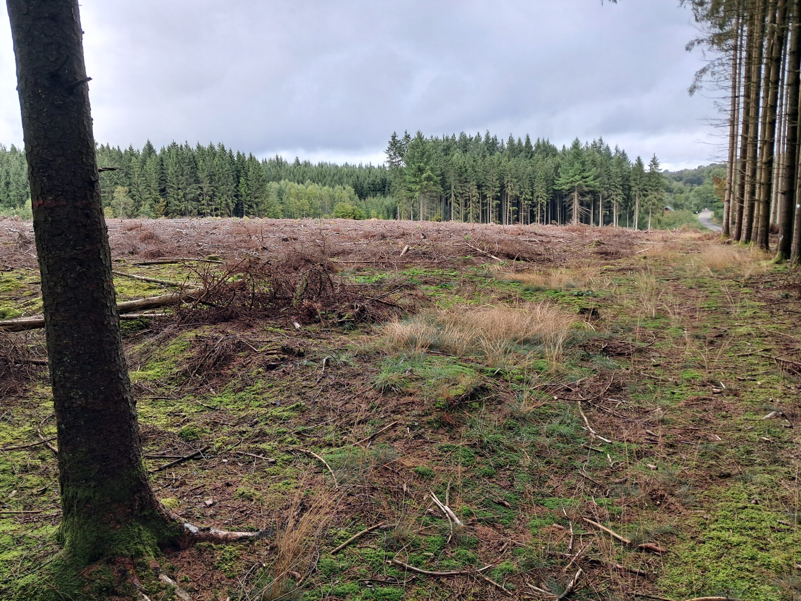 Fond de bois suite à une mise à blanc d’épicéas de 2024, situé à chemin empierré
