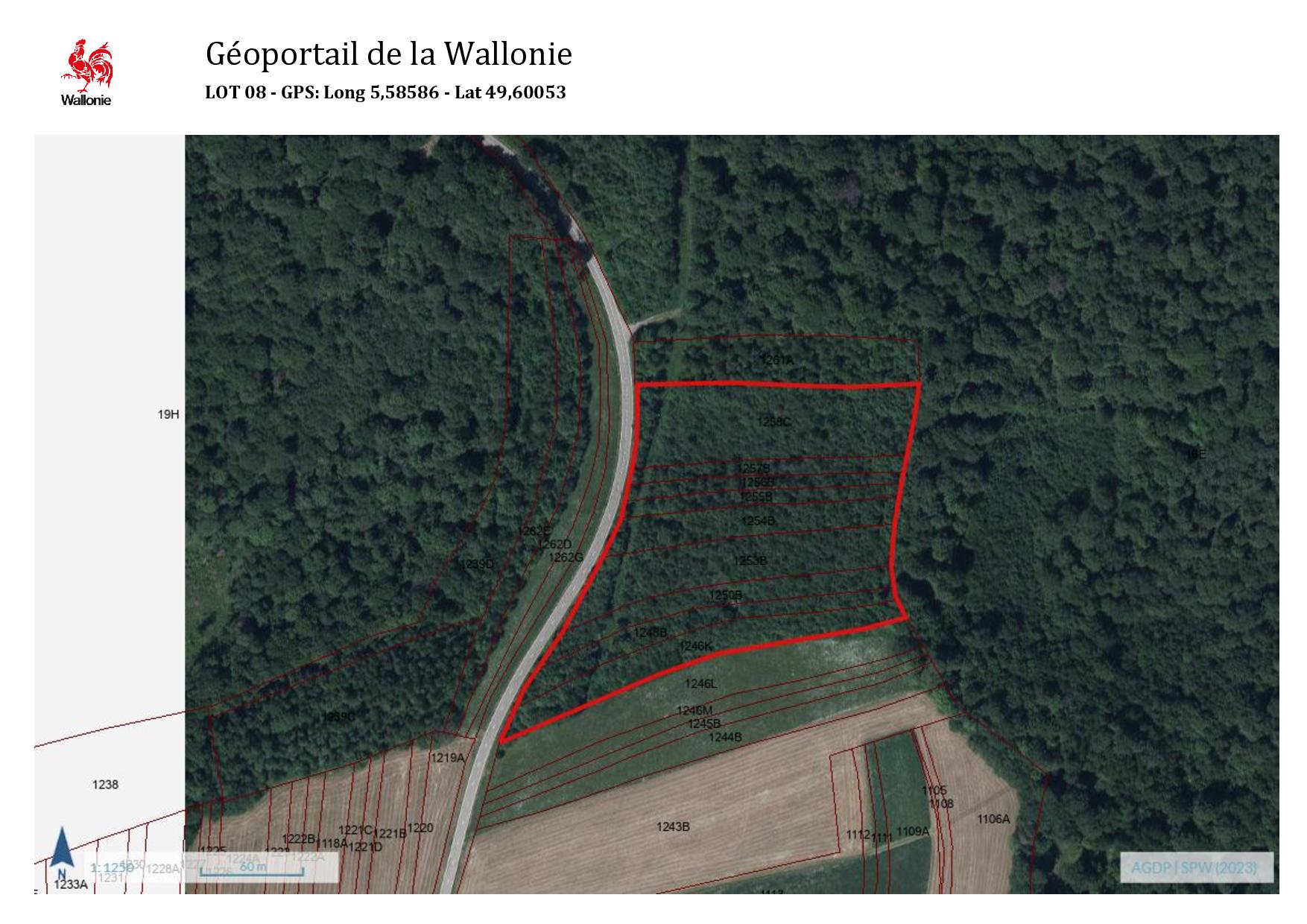 —Veuillez choisir une option— Ref. : Vielsalm, 1 ère Div. Vielsalm, Section I, n° 205 D, 205/2, 206 B, 207 C. Superficie totale cadastrée: 0,5664 ha - B-6690 VIELSALM, Route de la Hérongue (Belgique) Ref. : Libramont-Chevigny, 7 Div. Sainte-Marie Chevigny, Section C, n° 1001 A, 1003, 1025, 1023 B et 1002 E. Superficie totale cadastrée: 1,993 ha - B-6800 LIBRAMONT, Bernimont (Belgique) Ref. : Bastogne, 4 Div. Noville, Section B : n°1012 B et Section E: 0152 B - B-6600 BASTOGNE, Noville, Vaux (Belgique) Ref. : Bertrix, 1 ère Div. Bertrix, Section F, n° 172 B et 172 C. Superficie totale cadastrée: 1,469 ha - B-6880 BERTRIX, Auby-sur-Semois (Belgique) Ref. : Bertrix, 1 ère Div. Bertrix, Section F, n° 171 M et 171 P, superficie totale cadastrée: 1,152 ha - B-6880 BERTRIX, Auby-sur-Semois (Belgique) Ref. : Gouvy, 1 ère Div. Limerlé, Section C, n° 1737G, 1739A, 1740, 1742, 1746A, 1747. Superficie totale cadastrée: 1,7244 ha - B-6670 GOUVY, Steinbach (Belgique) Ref. : Virton, 3 Div. Ethe, Section B, n° 1254B, 1255B, 1256B, 1257B, 1258C, 1253B, 1250B, 1248B, 1246K - B-6760 VIRTON, Ethe, Rue du Château Cugnon (Belgique) Ref. : Fauvillers, 2 Div. Hollange, Section D, n° 422B, 338L, 341A, 342C, 343E, 345B, 353A, 363E, 372D, 374, 379F, 451, 452A, 461, 473C, 373B, 342B, 363G. Superficie totale estimée: 20,365 ha. Lot soumis à un bail à ferme. - B-6637 FAUVILLERS, Strainchamps, Rue des Troquettes (Belgique) Ref. : Bertrix, 3 Div. Cugnon, Section A, n° 0176 P0000. Superficie cadastrée: 1731 m2 - B-6880 BERTRIX, Cugnon, Les Illions (Belgique) Ref. : Vaux-sur-Sûre, 5 Div. Juseret, Section A, n° 2677 D et 2678 E - B-6642 VAUX-SUR-SURE, Bercheux (Belgique) Ref. : Vaux-sur-Sûre, 5 Div. Juseret, Section A, n° 3251B, 3251D, 3251C, 3251E, 3253B - B-6642 VAUX-SUR-SURE, Bercheux (Belgique) Ref. : Vaux-sur-Sûre, 5 Div. Juseret, Section B, n° 0102 G2 - B-6642 VAUX-SUR-SURE, Juseret, Allée des Jardins (Belgique) Ref. : Lierneux, 1 Div. Lierneux, Section C, n° 18E, 18F, 18H, 18K. - B-4990 LIERNEUX, Verleumont (Belgique)
