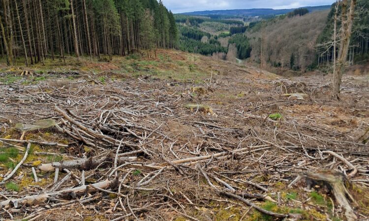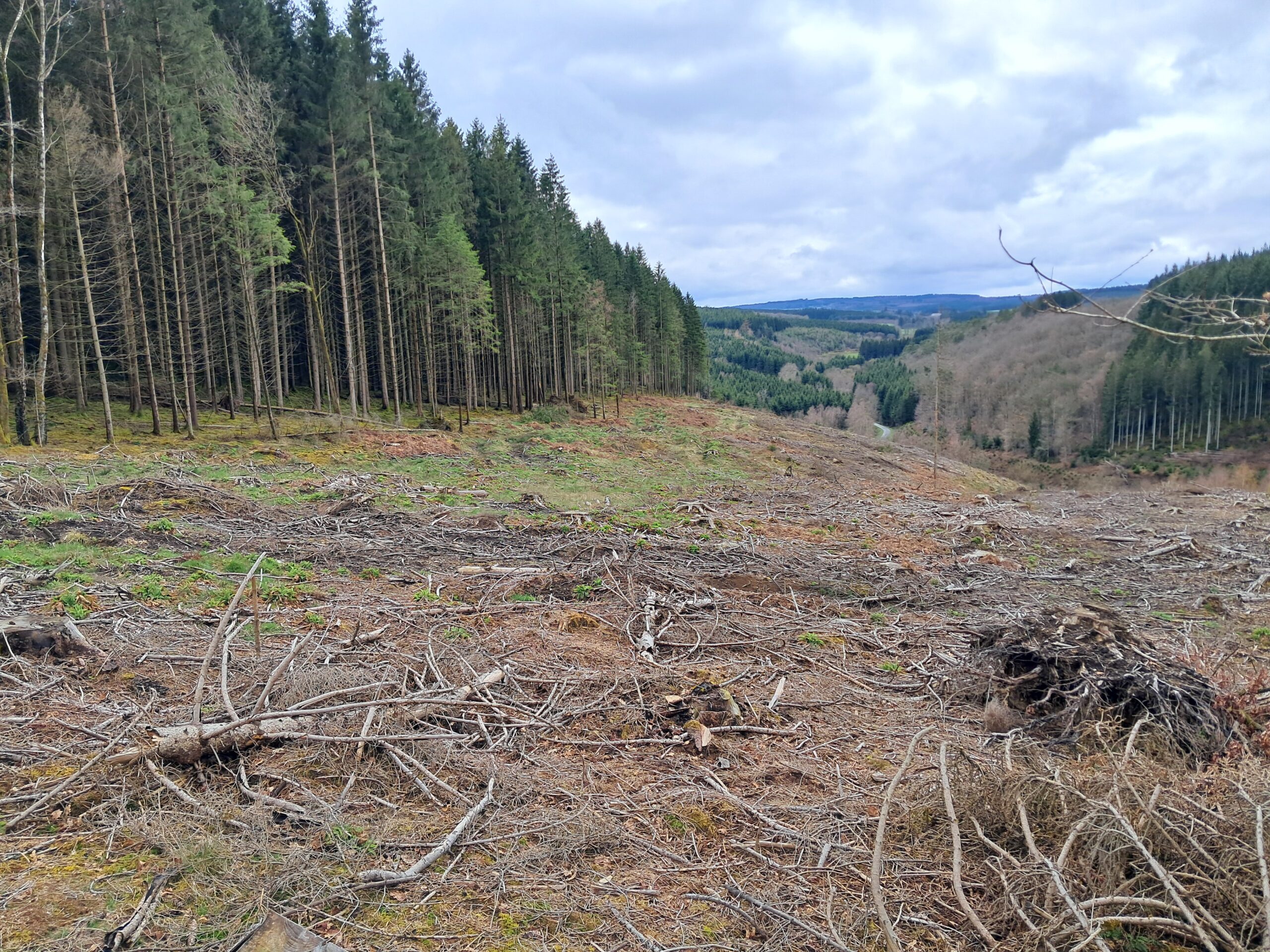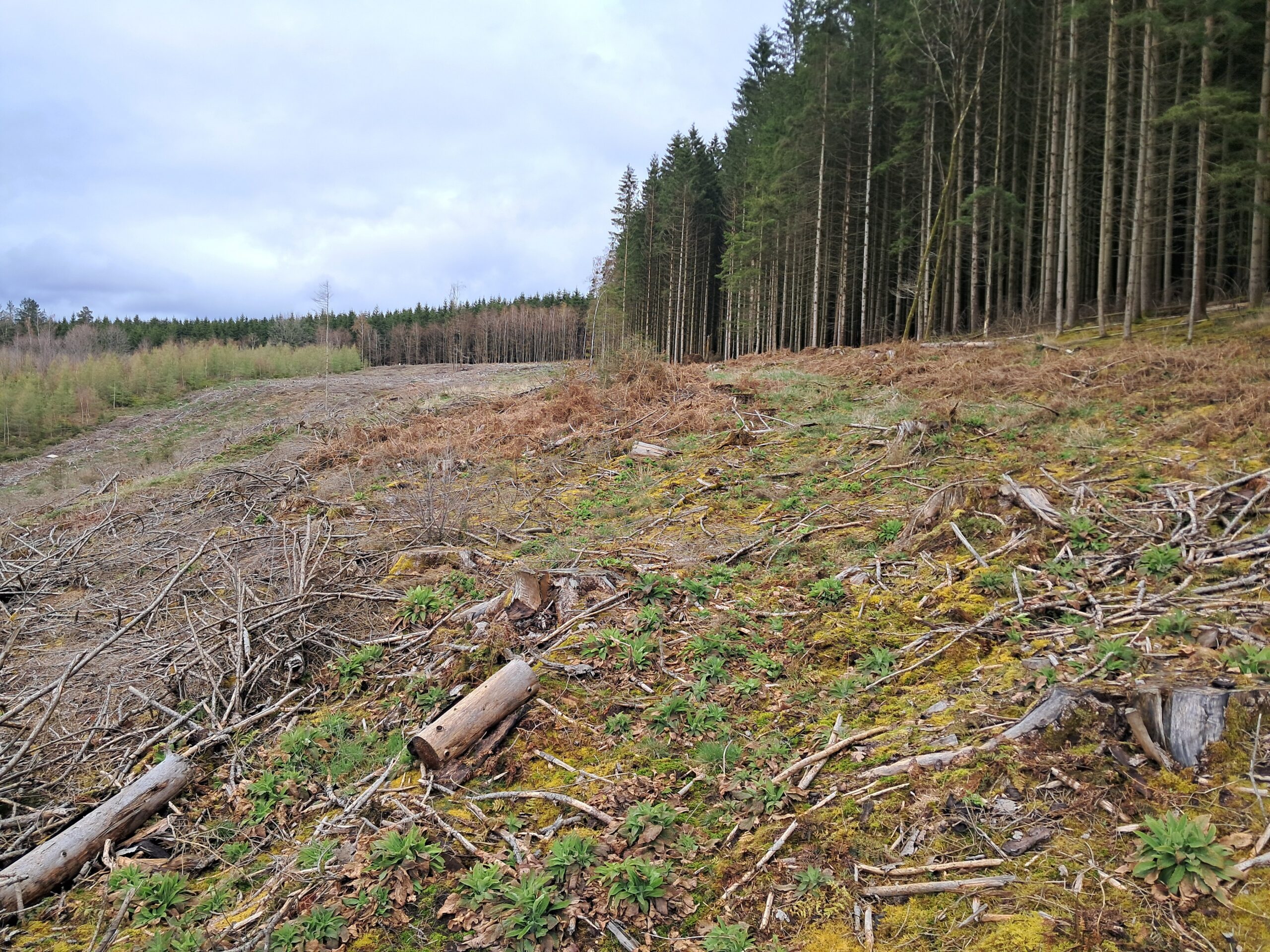 Fond de bois, soit un terrain déboisé suite à une coupe rase d’épicéas réalisée en 2024