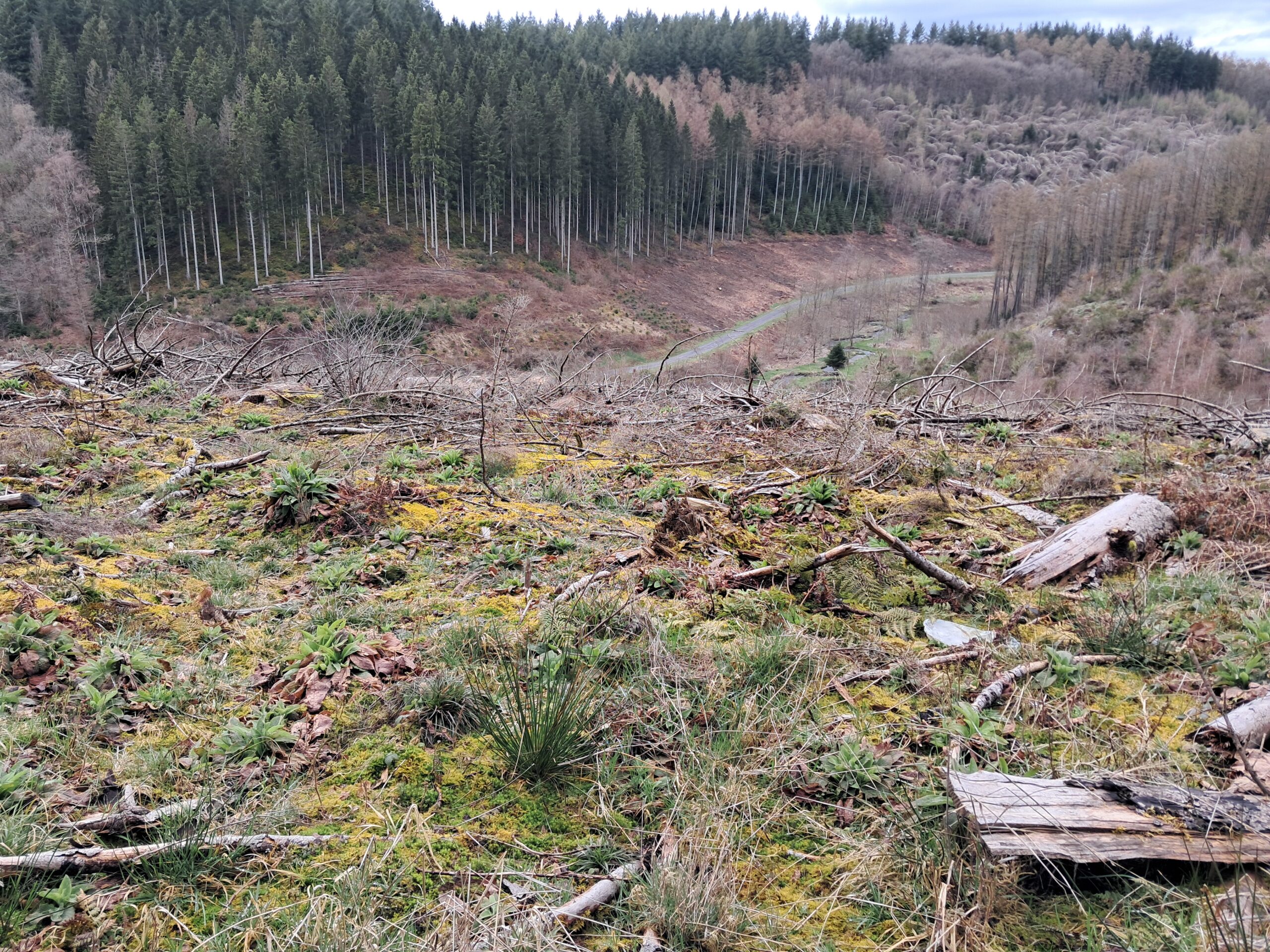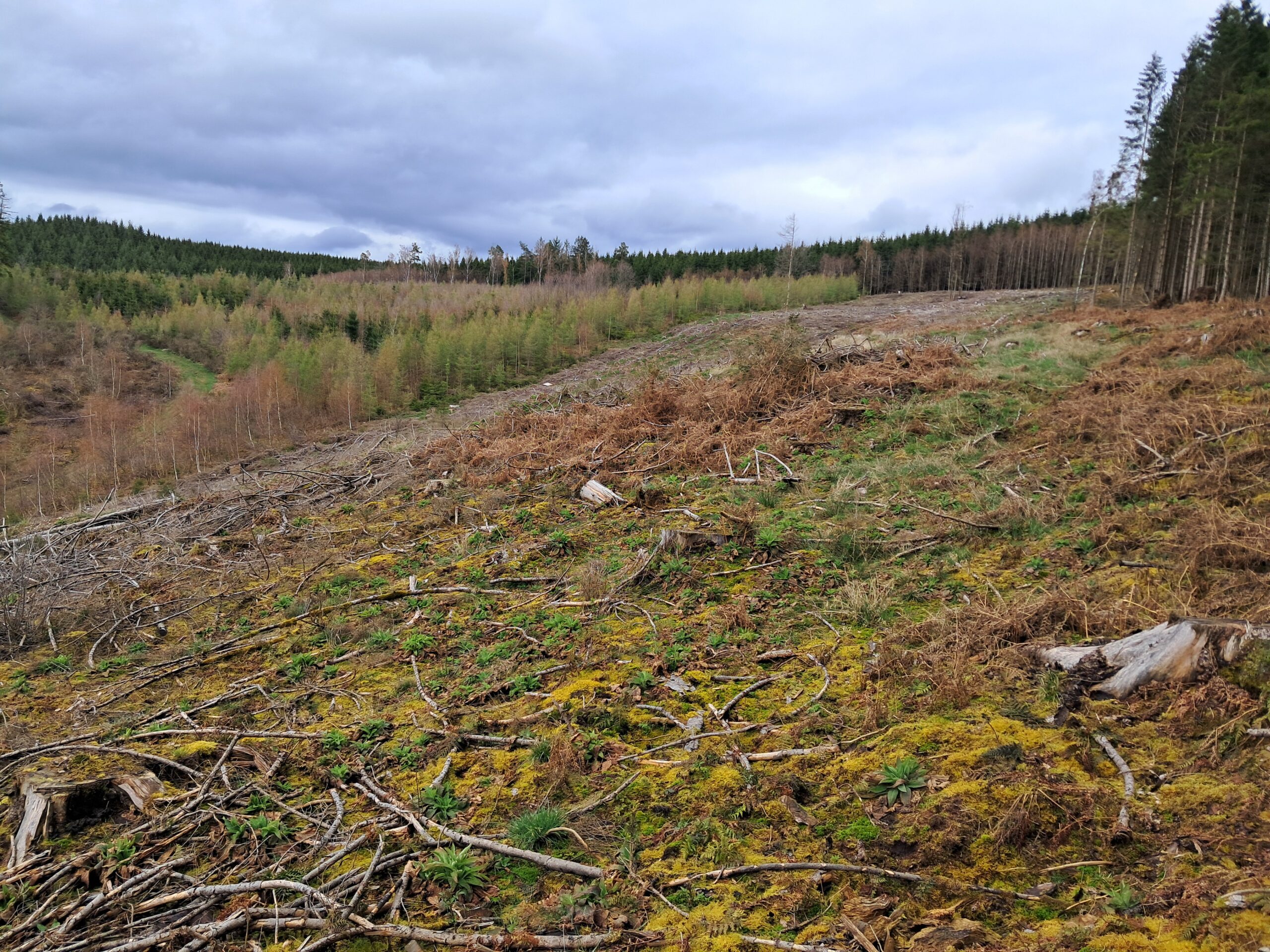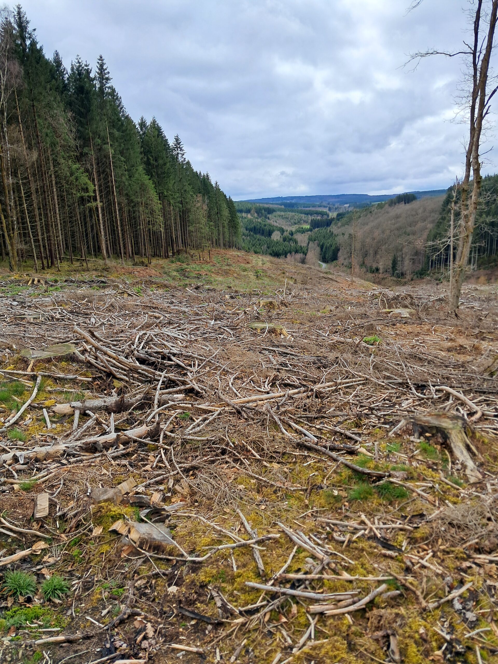 Fond de bois, soit un terrain déboisé suite à une coupe rase d’épicéas réalisée en 2024