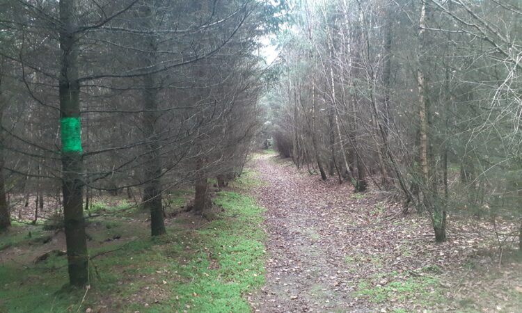 Ensemble à chemin forestier, épicéas et douglas d’aspect 22 ans.